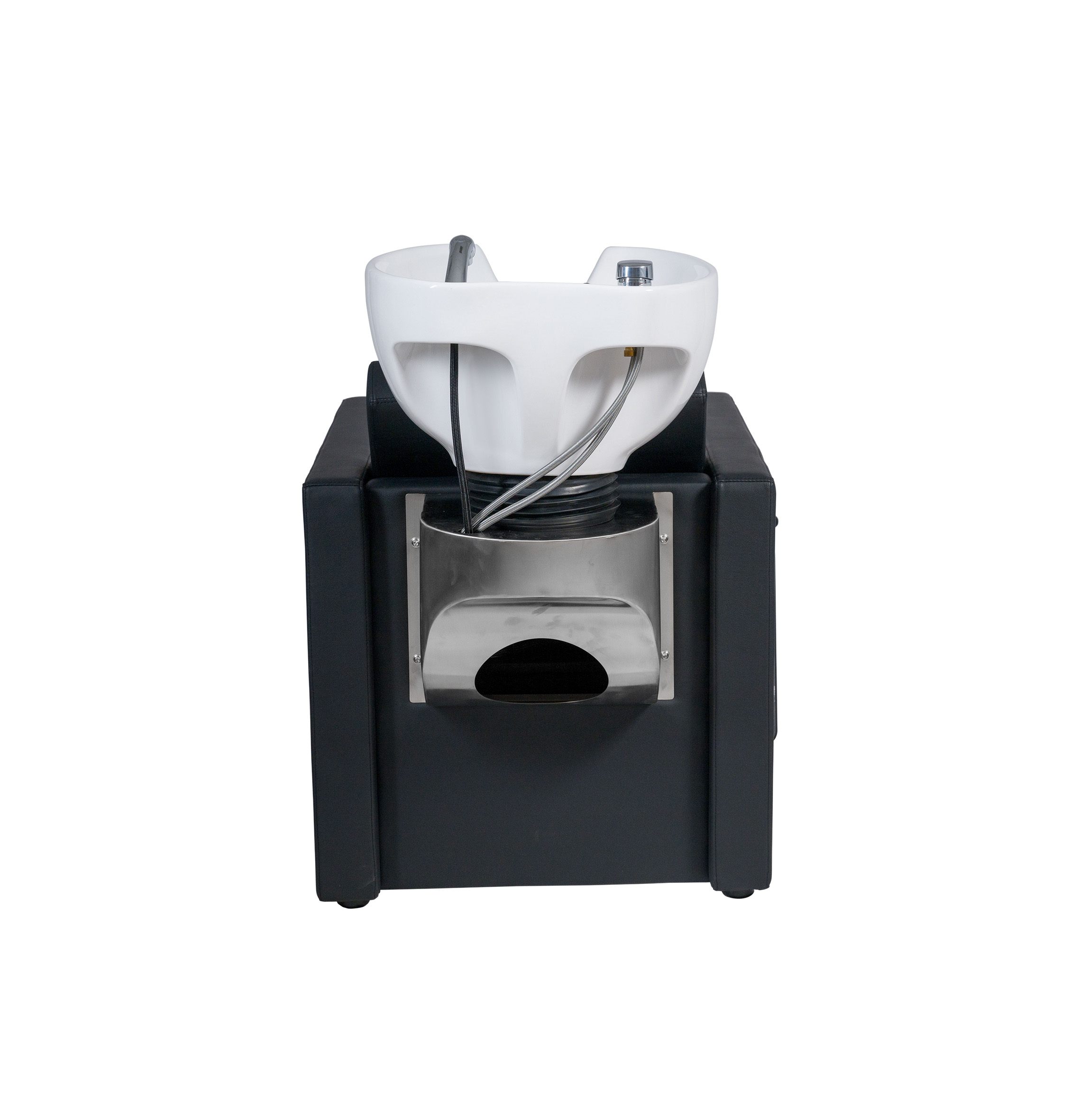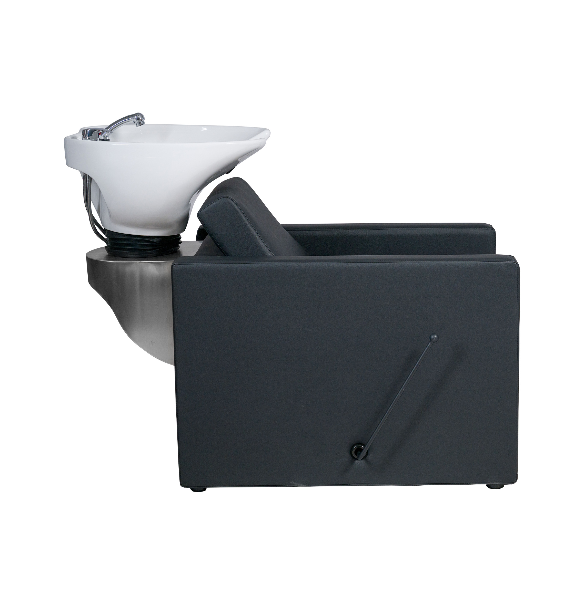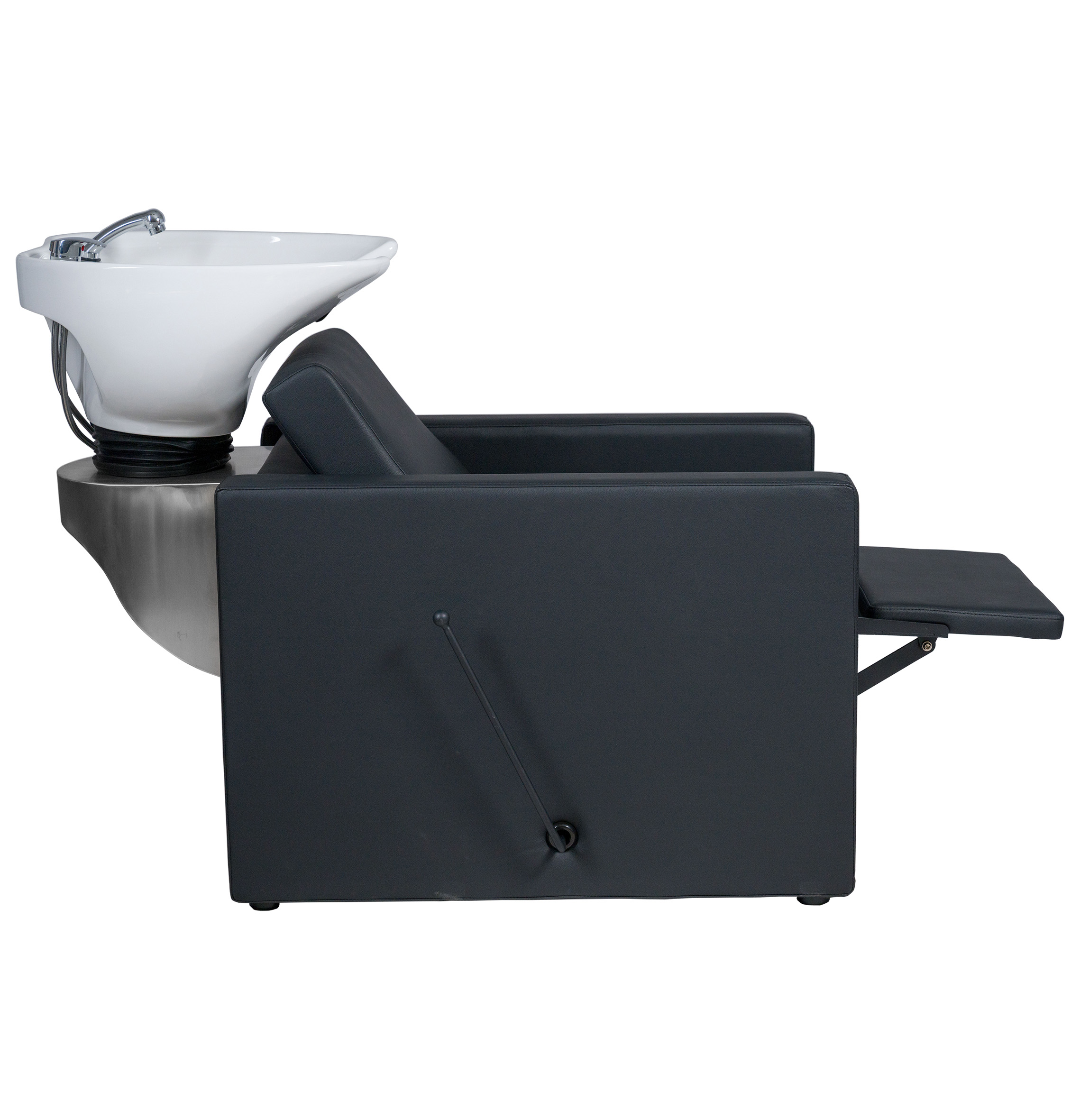 Fauteuil avec bac à shampooing avec repose-pieds pliable actionné par un levier manuel intégré, idéal pour le confort du client lors de traitements plus longs. Le meuble présente une structure intérieure métallique. Le siège et le dossier intègrent des ressorts pour plus de confort. Rembourrage supplémentaire sur la région lombaire. Cuvette en céramique blanche ou noire profonde et basculante.Robinetterie chromée de qualité avec tuyauterie en acier inoxydable. Douche chromée avec tuyauterie en polyamide. Système de drainage en acier inoxydable.Dossier amovible sans outils pour une installation facile. Revêtement en noir de haute qualité